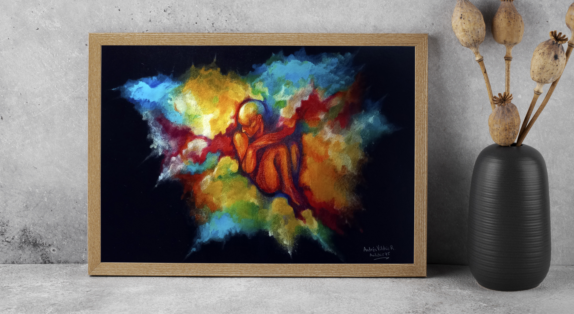 Esta obra se materializa después de un vívido sueño en el que se muestra como la consciencia se materializa de la nada (nace, por ello la posición fetal), representada por la oscuridad del negro de fondo y con una explosión de energía y vida, expresada por los colores y comienza a dar una mirada a la existencia.