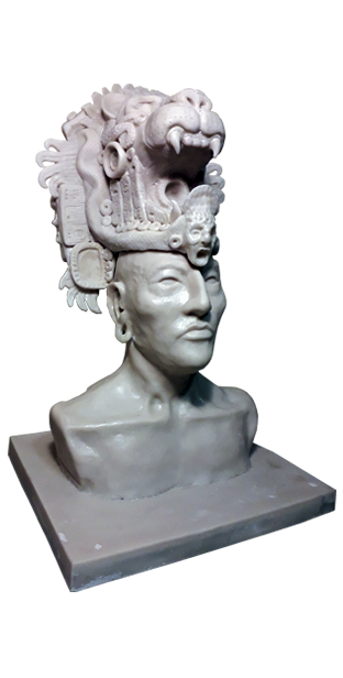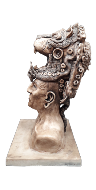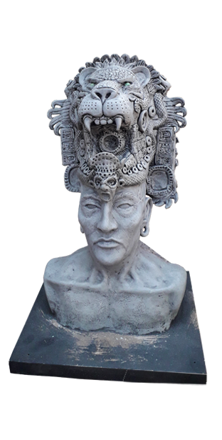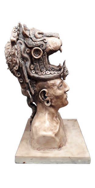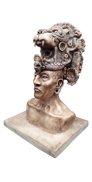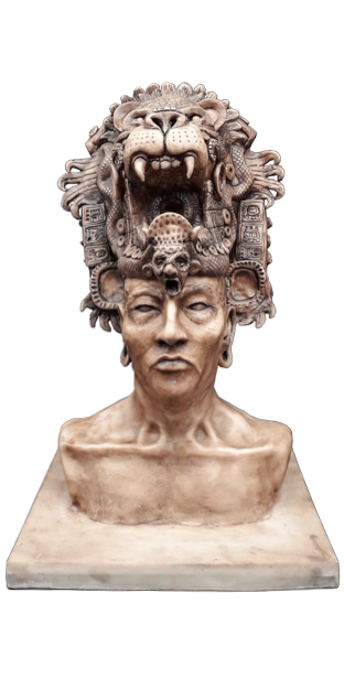 Al frente del yelmo se aprecia el Gran Jaguar con la mirada fija y con las fauces abiertas en señal de ataque, de su boca emana el símbolo del sol eclipsado, en la mejillas del felino se aprecian llamas solares y rodeando la cabeza del guerrero emanan dos serpientes que se unen en la frente formando una sola cabeza como símbolo de infinito a través de un ser de luz que está clamando por ese momento en que se fusionan el cuerpo, la mente y el espíritu del guerrero jaguar.