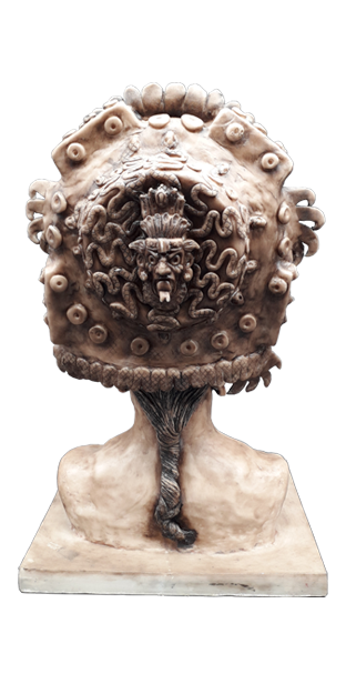 Al reverso del yelmo se aprecia la “gran serpiente” emergiendo de un círculo que simboliza el sol, esto representa el desdoblamiento del alma del guerrero y su elevación a lo esencial. Las serpientes que rodean la escena representan los rayos o la energía que emana de este evento y hay 18 “estrellas” que dan cuenta de ese momento.