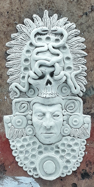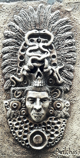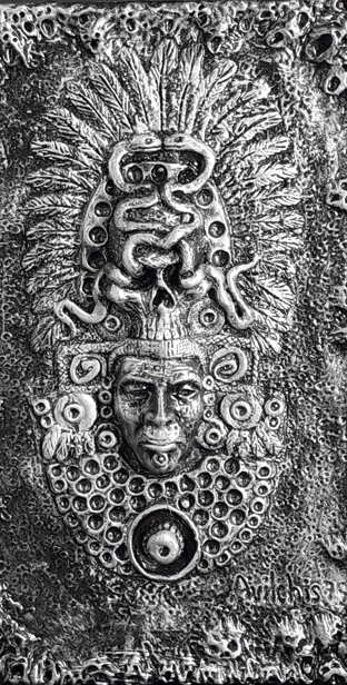 El conocimiento, la sabiduría y lo etéreo está representado por las plumas que justo rodean la escena en la que se comienza a materializar el encuentro del Nagual con su esencia, momento en que se funde con el todo y la naturaleza. Las serpientes saliendo de las oquedades del cráneo representan la trascendencia a la muerte.