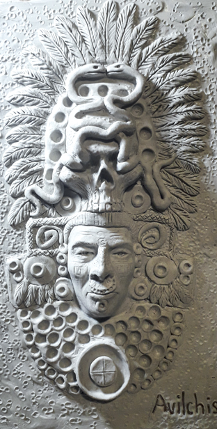 El sabio mirando la visión que se ha hace presente, que le sorprende pero que lo llena de intensa paz. De su pecho se abre un espacio que muestra la esencia y que se conecta con el todo, en ese estado puede verlo y sentirlo. Ese momento mágico esta representado por puntos que aparecen alrededor del personaje como electrizando el momento justo antes de que su Nahual aflore.