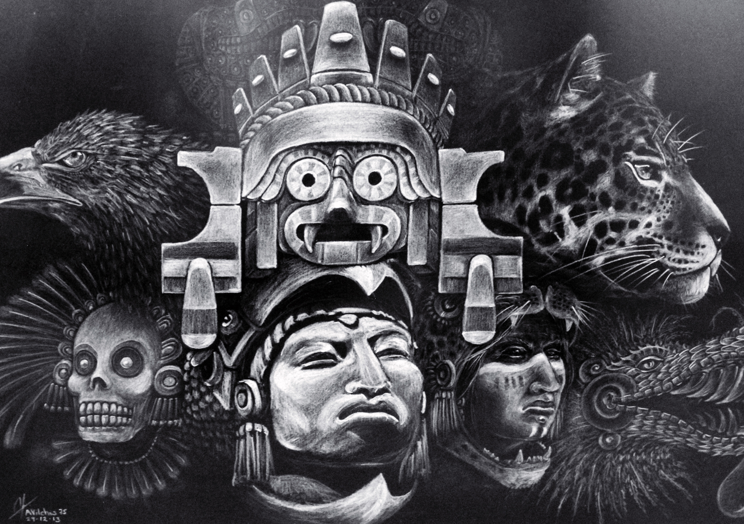 “Aquí la entidad de la Lluvia conocida como Tláloc que aparece justo arriba del rostro del Guerrero. Aquí quise transmitir la enorme conexión que existía en el pasado con los fenómenos naturales.”.